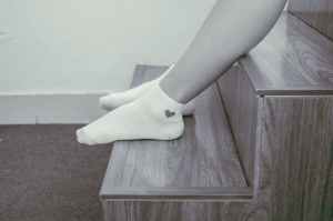 person wearing pair of foot socks sitting on staircase