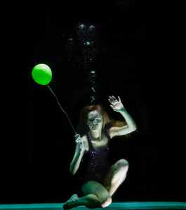 underwater photography of woman holding green balloon