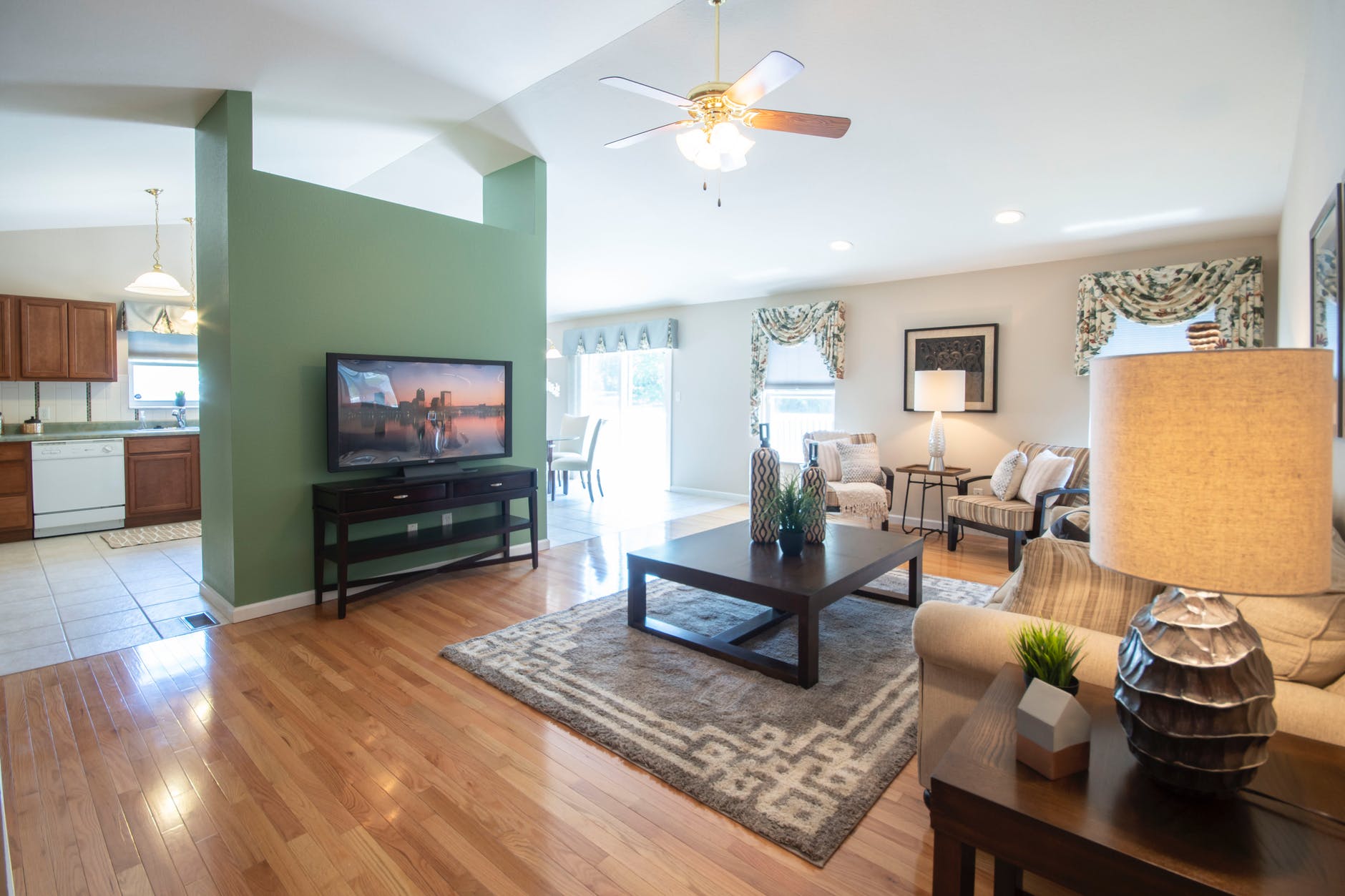 black flat screen tv turned on